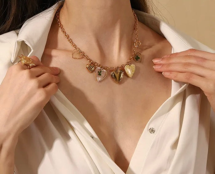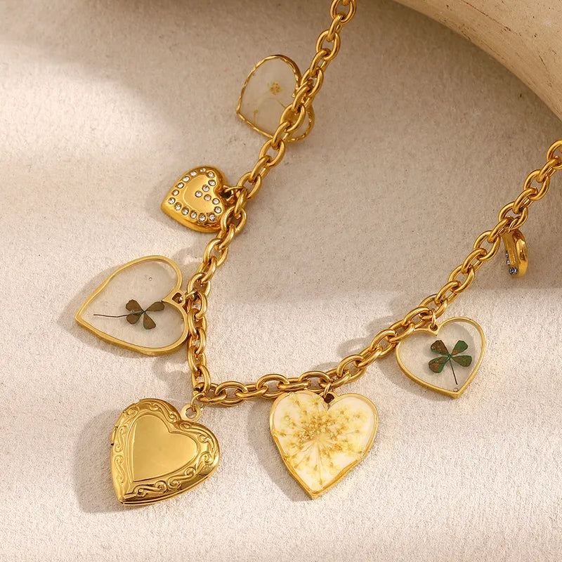 A whimsical chain featuring gold-plated stainless steel and heart charms with florals and clovers. Beachy, sweet, and perfect for layering.