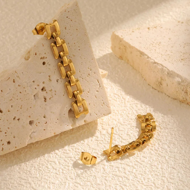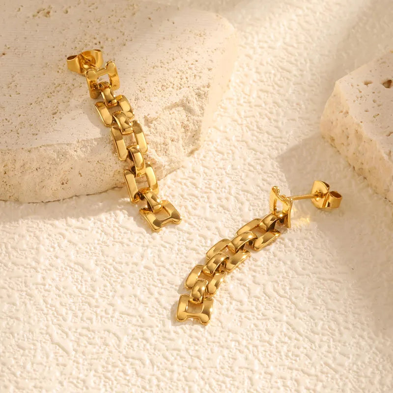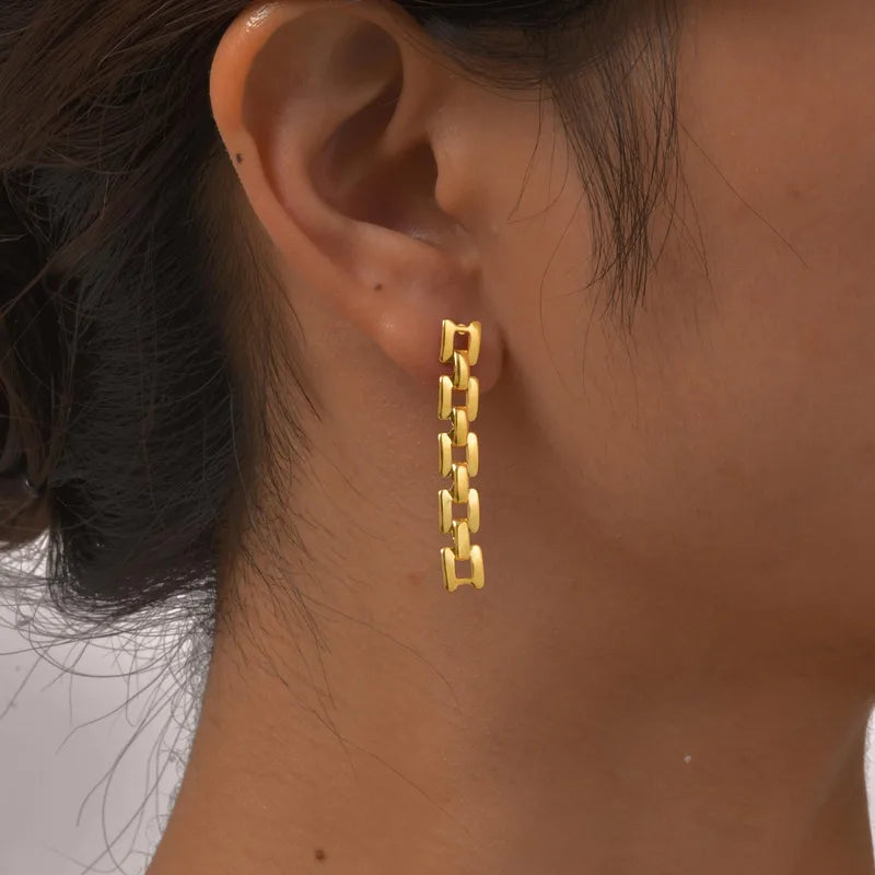 Sleek and structured, these 18K gold-plated drop earrings feature a bold chain-link design for a clean, elevated finish.