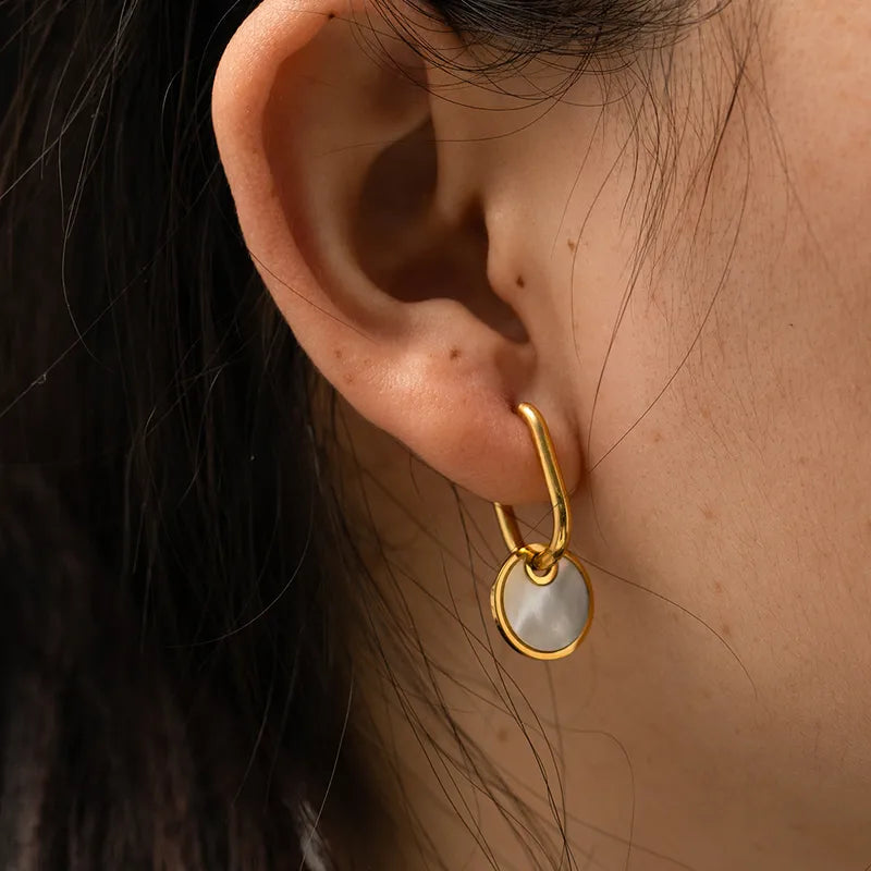 Delicate and minimal, these gold-tone drop earrings feature a glossy round shell inlay for a soft, coastal touch.