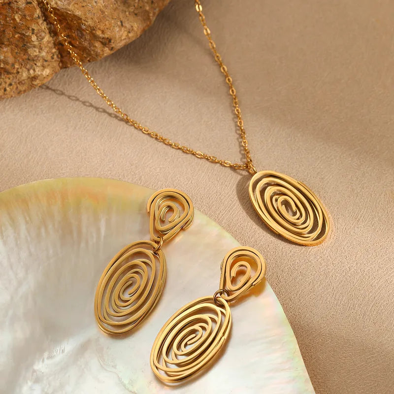 Add a touch of retro charm with this Spiral Stripe Earrings and Necklace Set. Crafted from 304 stainless steel and coated in rich gold plating, the abstract spiral design makes a bold yet artistic statement. Lightweight, durable, and resistant to tarnish, this duo pairs effortlessly with both casual and elevated looks.